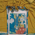 Purple tissue silk cotton unstitched salwar material,(soft, lining needed) multicolor floral printed allover, real mirror and zari lines on yoke, bright pink silk cotton bottom, embroidery and sequence work on chiffon dupatta with tapings. OC251607