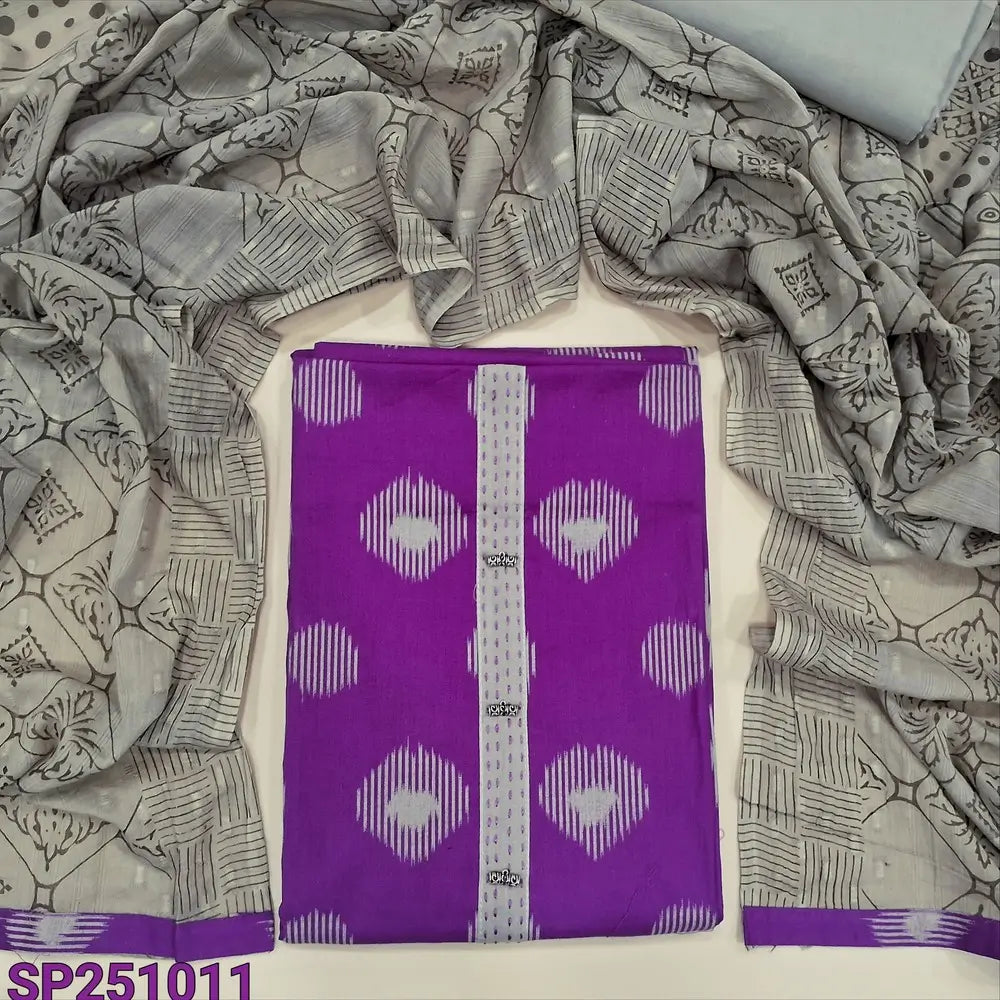Bright purplish pink printed pure cotton unstitched salwar material, fancy buttons& kantha stitch work on yoke(lining optional)greyish beige cotton bottom, printed jakard mul cotton dupatta. CODE SP251011