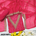 Red bandhini printed pure organza unstitched salwar material, v neck with zari& sequins work(thin fabric, lining needed)matching santoon bottom, pure organza short width dupatta dupatta with zari& sequins work. CODE JA251902