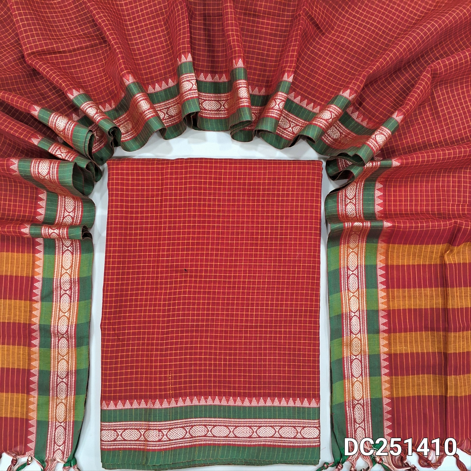 Red mercerised handloom cotton unstitched salwar material, checked all over, double side borders (Thin, Lining Needed) Fabric Measurement : 4.5 Metres, Full length dupatta. Note : Weaving Inconsistencies are not defects. DC251410