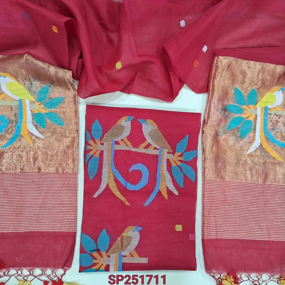 Red muslin jamdani unstitched salwar material, thread weaving on yoke& front(thin, lining needed)NO BOTTOM, muslin jamdani full length dupatta with tissue pallu& paithani weaving & handmade tassels. SP251711