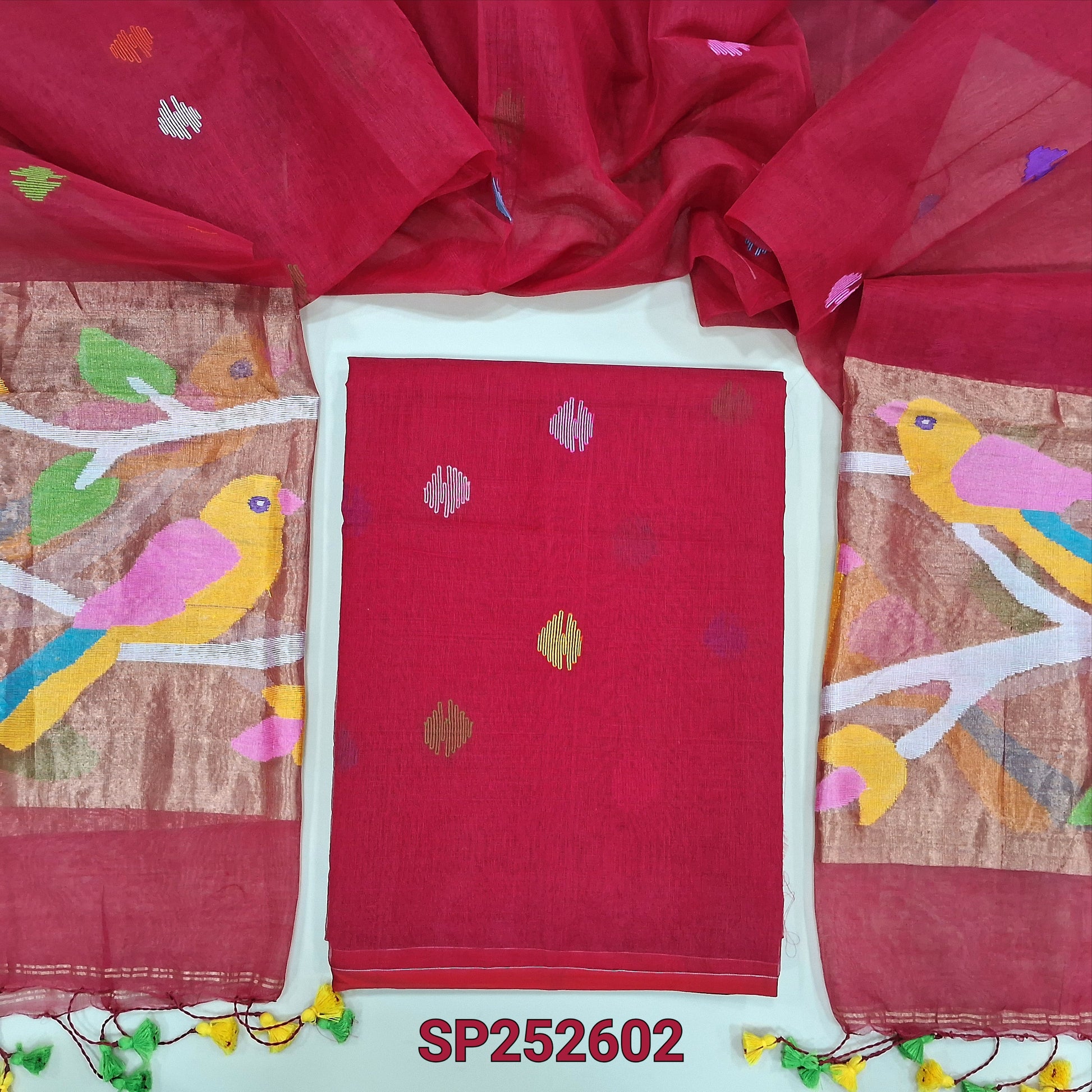 Red muslin jamdani unstitched salwar material, hand woven design all over(thin, lining needed)NO BOTTOM,hand woven muslin jamdani full length dupatta with rich paithani weaving pallu& hand made tassels. SP252602