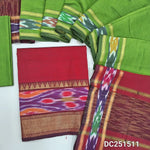 Red silk cotton unstitched salwar material, thread woven design on daman(lining needed) mossy green silk cotton bottom, dual shaded silk cotton dupatta with ikat woven borders & tassels. DC251511