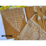 Reddish maroon batik dyed pure crepe georgette unstitched salwar material, embroidered on yoke(thin fabric, lining needed)matching santoon bottom, wax batik dyed crepe georgette dupatta(TAPINGS NEEDED). Code MY251304