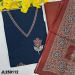 Reddish maroon premium cotton unstitched salwar material, v neck with thread & sequins work, rich floral embroidered on front(lining optional)blue cotton bottom, pure printed soft mul cotton dupatta. CODE JL250110