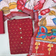 Reddish maroon slub silk cotton unstitched salwar material (lining needed) fancy buttons on yoke,zari woven buttas all over, matching silk cotton bottom, colorful kalamkari digital printed silk cotton dupatta. FB261201