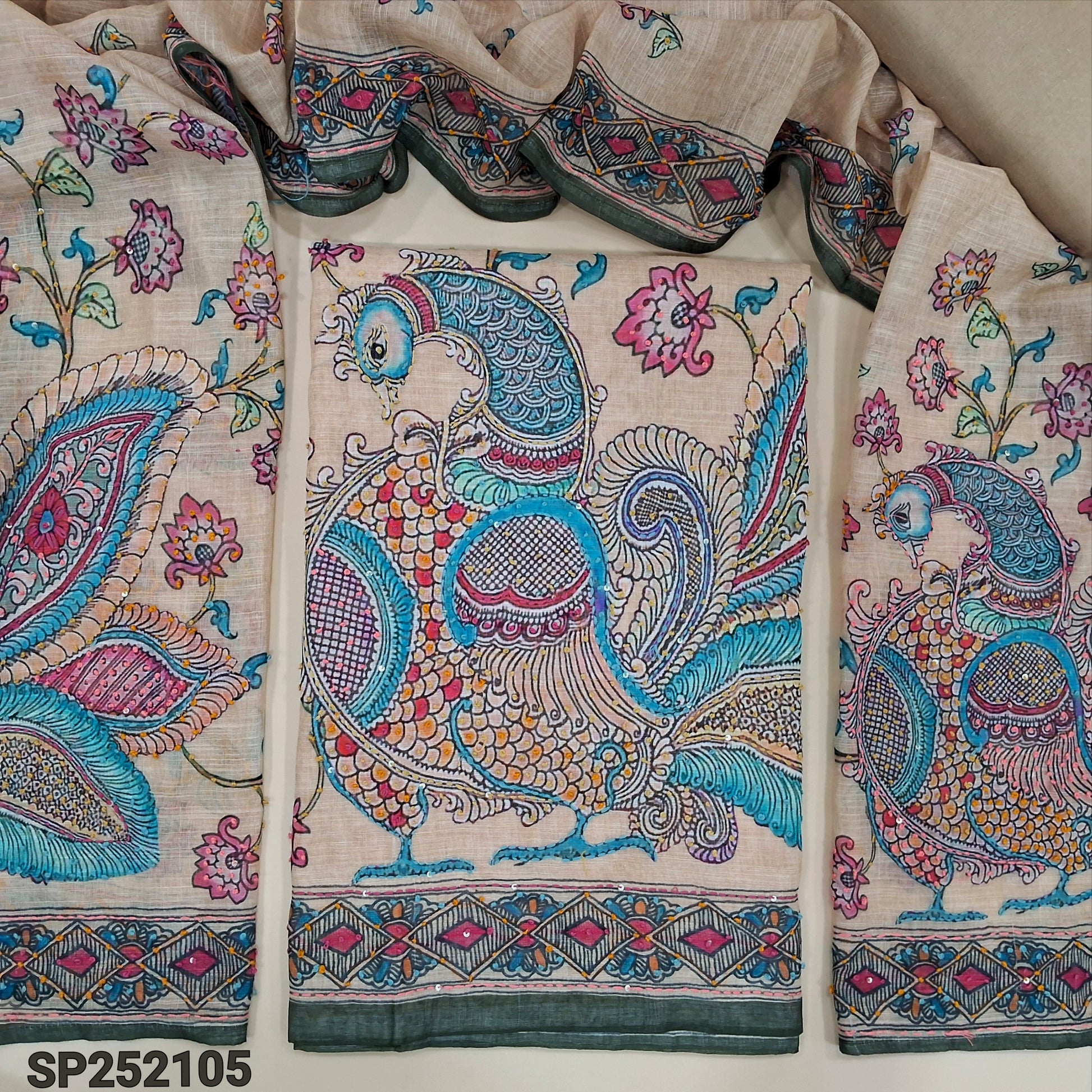 Rich beige premium linen kalamkari printed unstitched salwar material (textured, lining needed) rich hand embroidery work on daman, matching santoon bottom, kalamkari printed premium linen dupatta with rich embroidery. SP252105