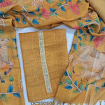 Royal blue premium tissue linen unstitched salwar material, digital prints with embroidery work on yoke and daman (Textured, Lining Needed) matching santoon bottom, hand embroidered tissue linen dupatta. OC250508