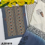 Sage green pure kantha cotton unstitched salwar material, printed yoke, faux mirror work on yoke &front(lining needed)zigzag printed flex cotton bottom, block printed dual shaded chiffon dupatta with lace tapings. CODE JL251817: