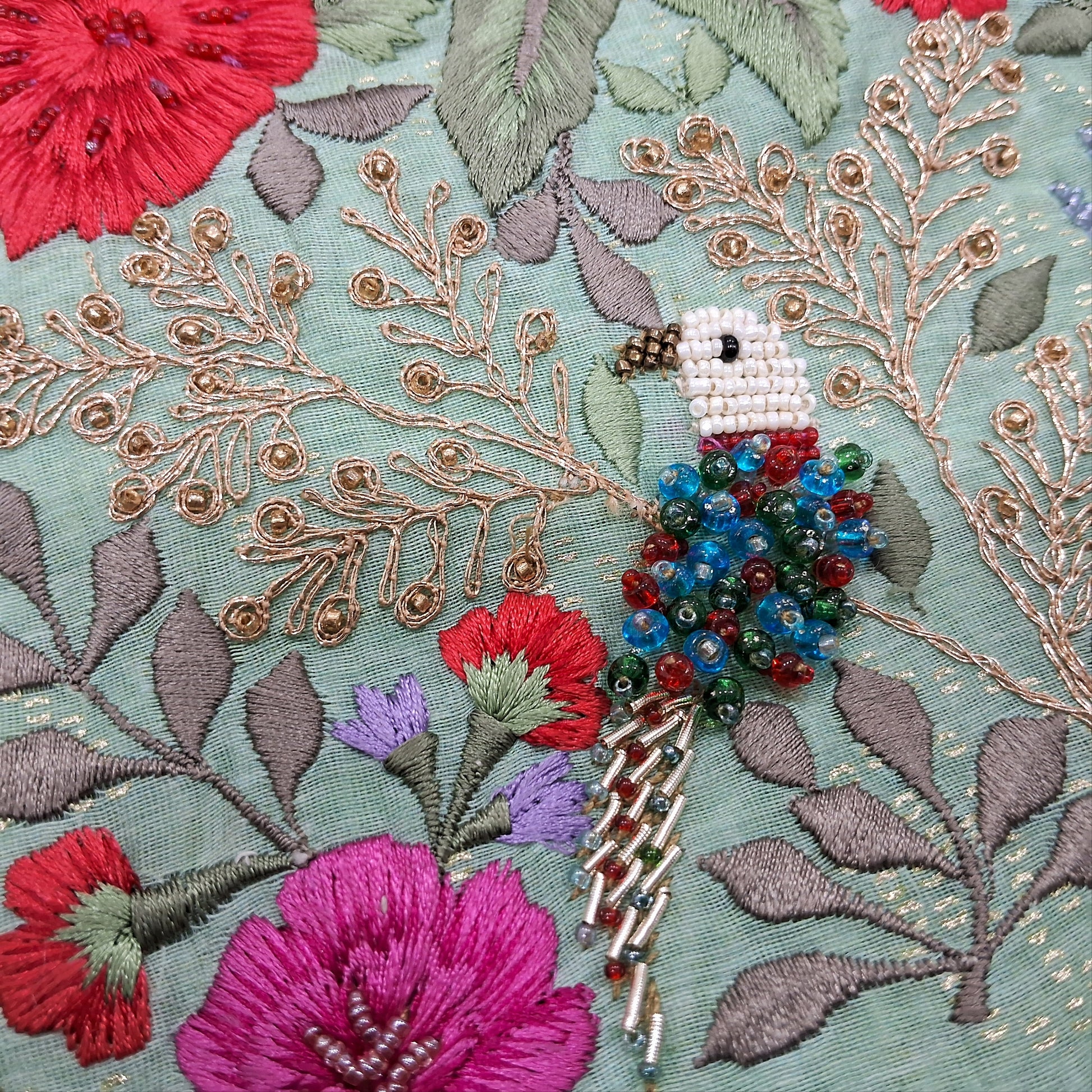 Sea green printed premium silk cotton unstitched salwar material,embroidery and handmade bead work on yoke(thin,lining needed) premium silky bottom,premium organza short width dupatta with embroidery and cutwork on borders. SP252111