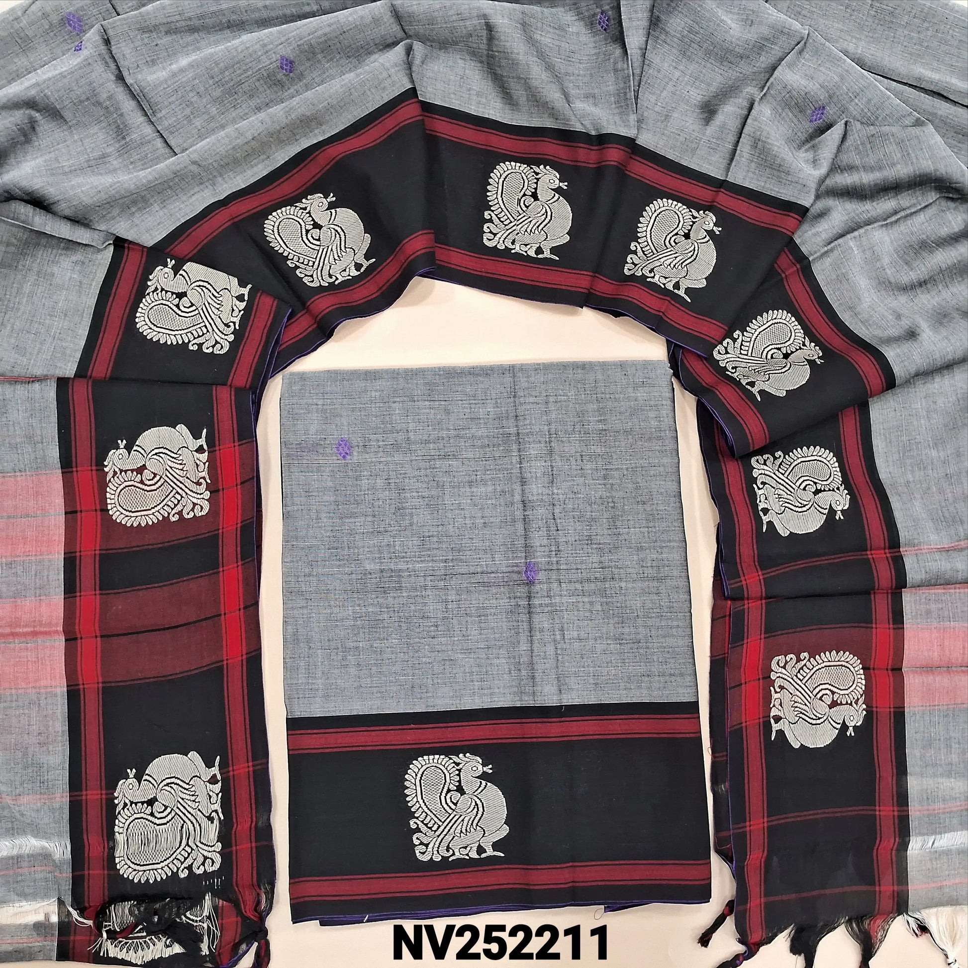 Silver grey mercerized handloom cotton unstitched salwar material,thread woven buttas on front, contrast thread weaving on daman, 4.5 metres,(Thin, Lining Needed)mercerized handloom cotton Full length dupatta with double side borders. NV252211