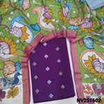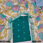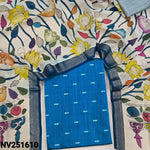 Turquoise blue premium raw silk unstitched salwar material (textured, Lining Needed) thread woven buttas all over, silver grey silk cotton bottom, original pen kalamkari silk dupatta with zari borders. NV251612