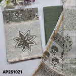 Light turquoise green floral printed premium satin cotton unstitched salwar material, rich daman with schiffli& applique work(lining needed)matching drum dyed cotton lining provided, NO BOTTOM, block printed fancy kota dupatta. CODE AP251018