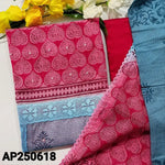 Turquoise green &onion pink block printed fancy kota unstitched salwar material, panel pattern with lace& faux mirror work(thin, lining needed)matching silk cotton bottom, dual shaded block printed fancy kota dupatta with lace tapings. CODE AP250617