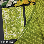 Dark turquoise green printed pure soft cotton unstitched salwar material, thread& sequins work on yoke(thin fabric, lining needed)zigzag printed cotton bottom, printed crinkled pure soft cotton dupatta. Code AP252108