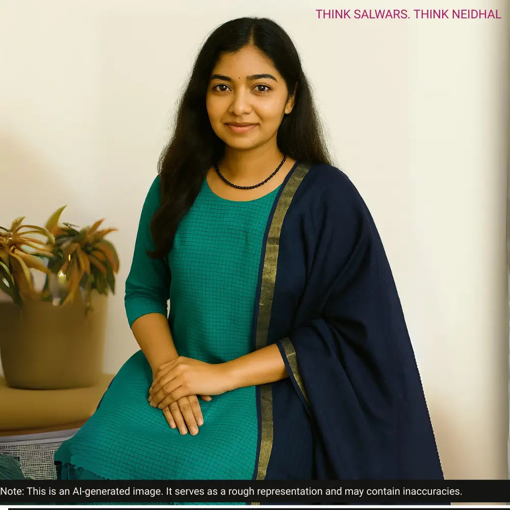 Turquoise green south handloom cotton unstitched salwar material(lining needed)navy blue handloom cotton bottom, self checkered handloom cotton dupatta with zari borders. CODE AG252908