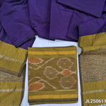 Violet silk cotton unstitched salwar material, thread woven design on daman(SLIGHT INCONSISTANCY OF WEAVING IS NOT CONSIDER AS DEFECT)(lining needed)pastel pink silk cotton bottom, dual shaded silk cotton dupatta with tassels. CODE JL250608