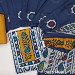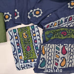 Wax batik dyed Blue pure cotton unstitched salwar material (lining needed) thread, faux mirror work on yoke, turquoise Blue cotton bottom, batik dyed mul cotton full length dupatta(TAPING NEEDED). JA261409