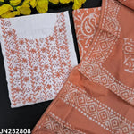 White chikankari embroidered pure cotton unstitched salwar material, hand embroidered on yoke(lining needed)purple batik cotton bottom, batik dyed pure mul cotton full length dupatta with lace tapings. CODE JN252805