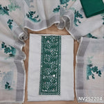 White fancy linen unstitched salwar material,embroidery, faux mirror and thread work on yoke,(thin, lining needed)purple silky or silk cotton bottom,floral printed semi linen dupatta with silver tissue borders. NV252203