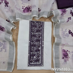 White fancy linen unstitched salwar material,embroidery, faux mirror and thread work on yoke,(thin, lining needed)maroon silky or silk cotton bottom,floral printed semi linen dupatta with silver tissue borders. NV252205