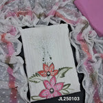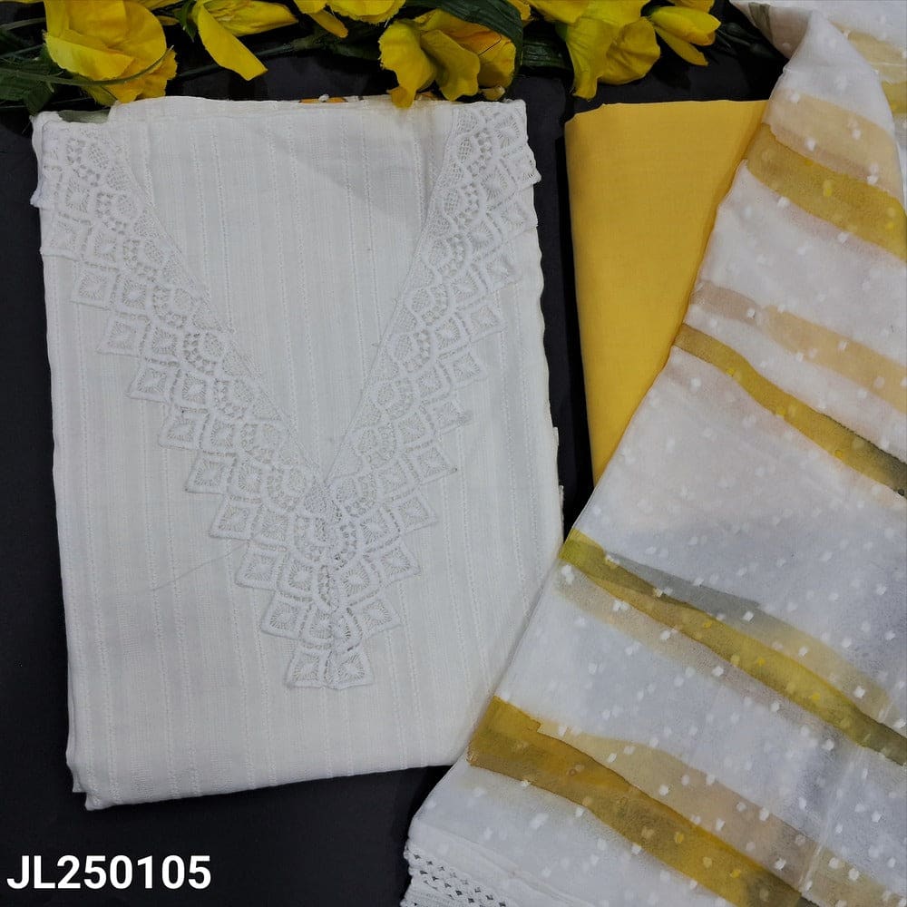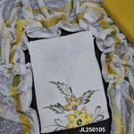 White pure jakard cotton unstitched salwar material, v neck with lace work, brush paint with real mirror work on front, lace work on daman(lining needed)yellow cotton bottom, jakard chiffon dupatta with brush paint work. CODE JL250105