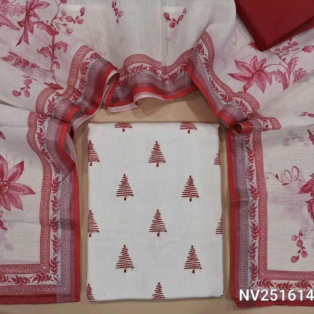 White semi linen unstitched salwar material (textured,lining needed)thread embroidery on front, red silk cotton botttom, digital floral printed semi linen dupatta. NV251614