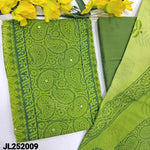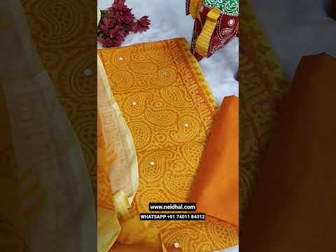 Bright mango yellow& pastel yellow block printed semi georgette unstitched salwar material, panel pattern on front(thin fabric, lining needed)matching silk cotton bottom, block printed dual shaded fancy chiffon dupatta. CODE JL252007