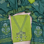 Yellow premium handloom cotton unstitched salwar material, V neckline and applique work on yoke (Thin, Lining Needed) Contrast maroon cotton bottom, handblock printed mul cotton dupatta. NV251514