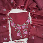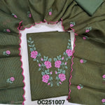 Mehandhi yellow kota silk cotton unstitched salwar material(thin, lining needed) embroidery work on yoke, matching silky bottom, embroidery work on kota silk cotton dupatta with scalped border. OC251011